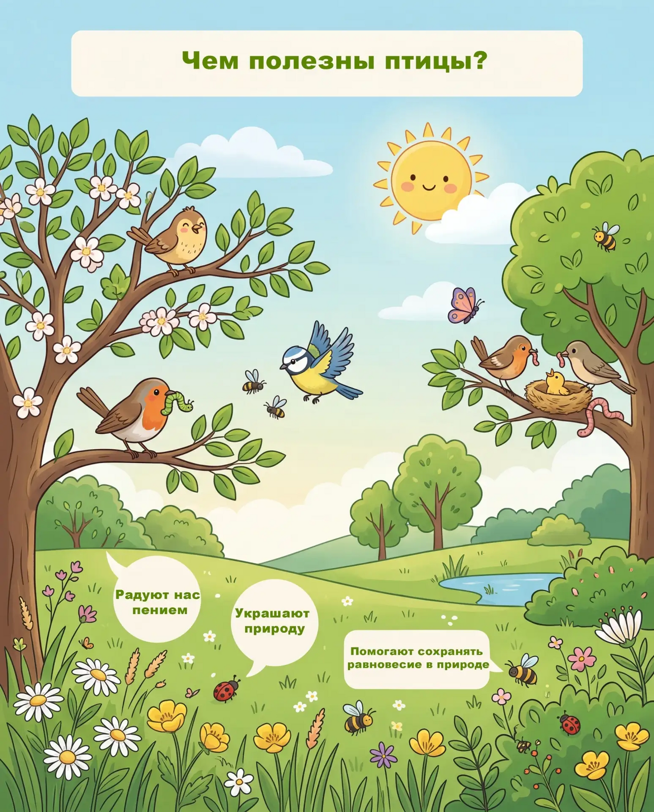 Птицы играют огромную роль в балансе биоценоза. Они верные друзья человека, регулируют популяции насекомых и грызунов, в том числе откровенных вредителей, способствуют распространению семян, сами являются звеном пищевой цепочки. Их гибель приведет к нарушению биологического баланса природы.